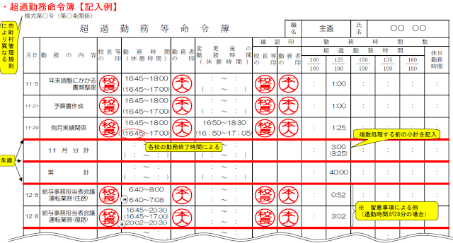 また、国家公務員の残業は、超過勤務命令なる仰々しい命令に基づいて、実施することになっていますが、超過勤務命令簿なる無意味極まりない書類を作成して管理しています。